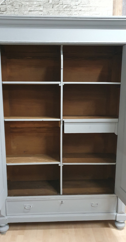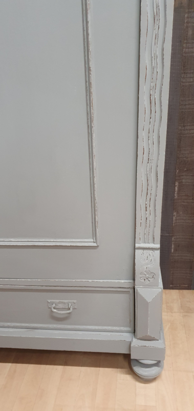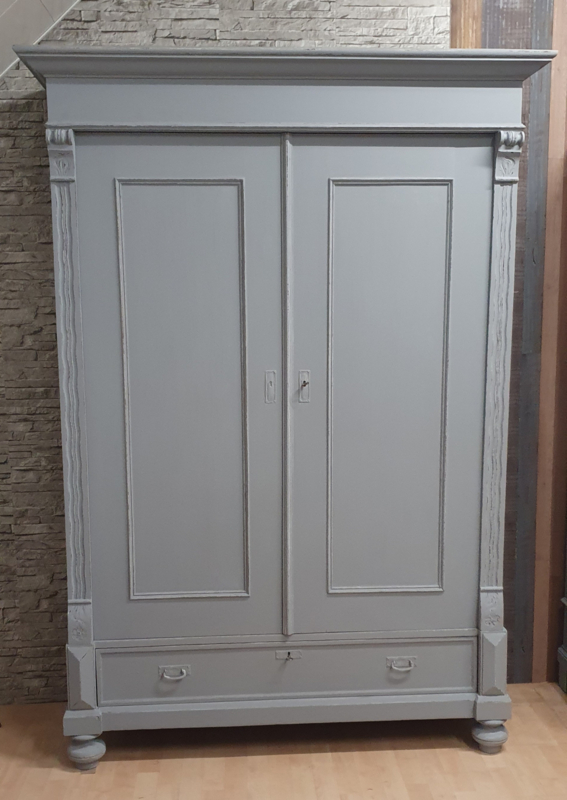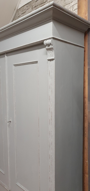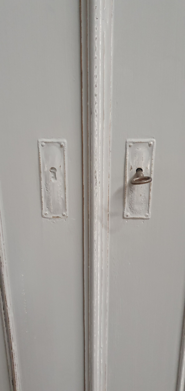 OverzichtEen grote brocante meidenkast in grijs met doorgeschuurde randen voor een landelijke uitstraling. De kast kan helemaal uitelkaar en is dus overal te plaatsen. Achter de deuren zitten planken en een lade. Onder zit een la over de hele breedte. De sleutels zijn aanwezig en de sloten werken prima. De zijden naast de deuren hebben figuren waardoor de kast minder strak is.