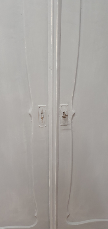 OverzichtBrocante Hollandse meidenkast in grijs met doorgeschuurde randen. Achter de deuren zitten planken en een lade. Het slot werkt goed en de sleutel is aanwezig. De kast is in prima staat.