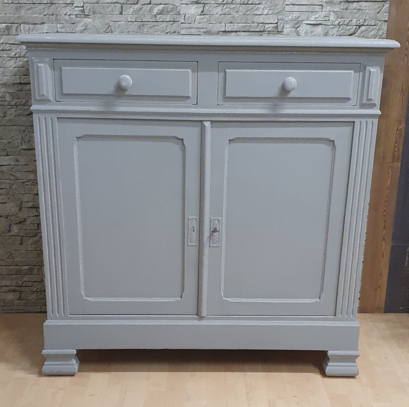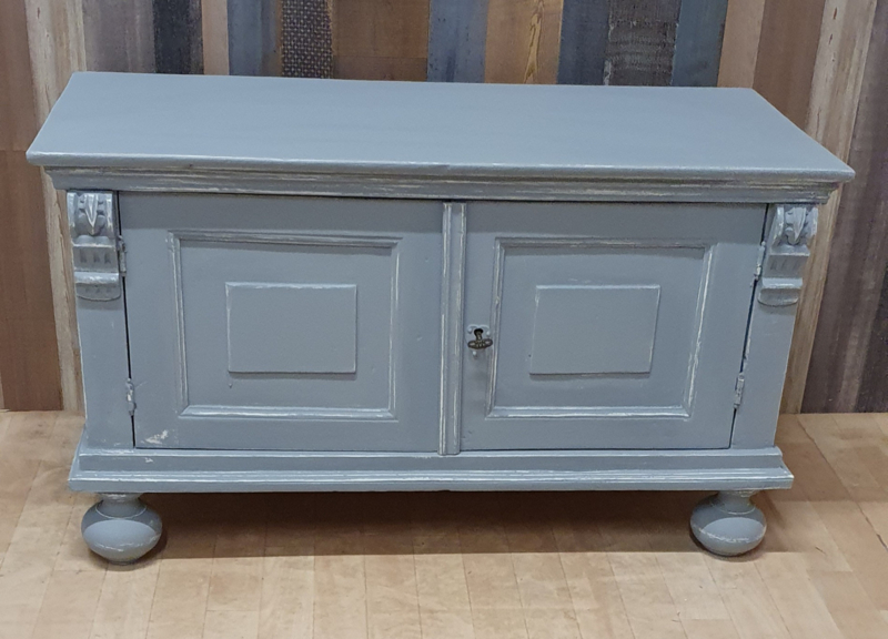 Brocant meidenkastje of laag kastje met ornamentenEen prachtige brocante meidenkast in grijs met twee deurtjes. Achter de deuren zit een plank. Het slot werkt goed.